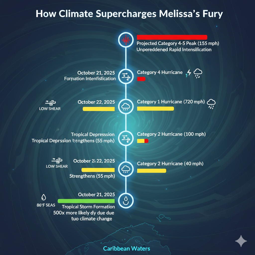 - Infographic: Melissa’s Rapid Intensification Timeline A vertical timeline diagram showing hourly wind speed increases from October 21 (40 mph) to October 27 (projected 155 mph), with icons for triggers (warm water, low shear). Color-coded bars for probability (green low, red high). Alt text: Infographic illustrating rapid intensification of Hurricane Melissa amid climate change, highlighting wind speed jumps over warm Caribbean waters.